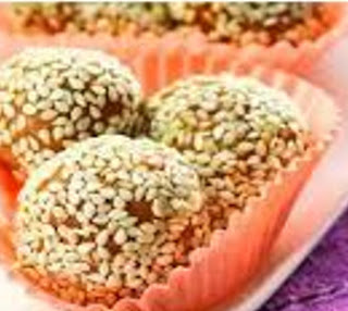4. Ambilah sedikit adonan. Berilah isi. Bentuklah bola-bola. Gulingkanlah diatas wijen.